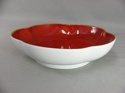 深川製磁の盛鉢です。外は白磁、内は鮮やかな朱に染められ金の縁取りが施されています。おめでたい席などに最適なうつわです。