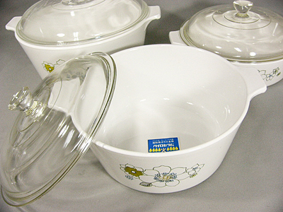 アメリカ、コーニング社のパイロセラム蓋付きキャセロール大中小3点セットです。超耐熱ガラスパイロセラム製なので直火、オーブン、電子レンジも対応する大変便利なキッチンウェアです。冷蔵庫で保存して、直接調理し、そのまま食卓へ。清潔でおしゃれなデザインなので食卓に並べても違和感を感じません。大サイズのなかに中サイズの鍋がそっくり入るので収納も便利です。しかし中サイズと小サイズの鍋は径が同じなので中には収まりません。3つを重ねてみましたので写真をご参照ください。