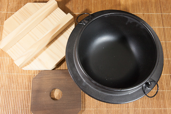 耐熱ごはん鍋です。どっしりとした木製蓋、敷板付きです。取説は付属していません。持ちてのリングが付いていますので、アウトドアでも使い勝手の良いお釜です。
