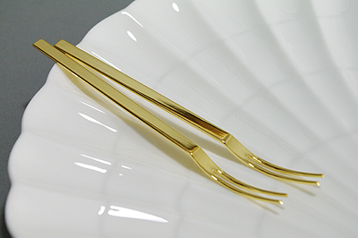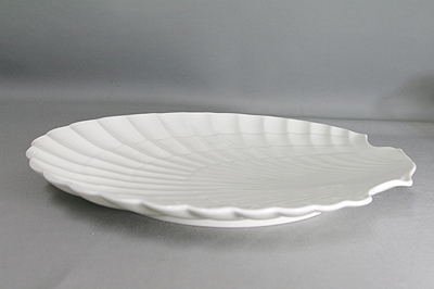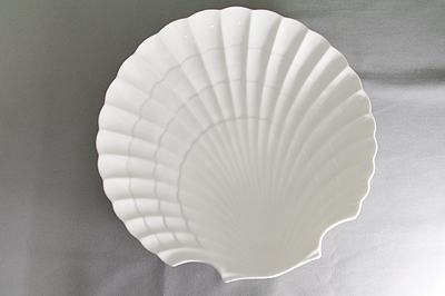 ナルミのシェル型プレート1枚、ピック5本セットです。りんごや梨をカットしてプレートに盛付け、ピックで頂く。そんなコンセプトでデザインされたのでしょう。光が当たったときの陰影が印象的なプレートです。高級磁器ナルミボーンチャイナ製。ピックはステンレス製。