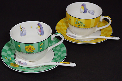 ナルミのカップ&ソーサー2客、磁器製スプーン2本のセットです。絵がわりの可愛らしいペンギンのイラストがデザインされています。