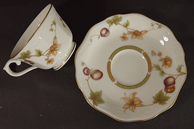 ノリタケのカップ&ソーサー2客セットです。落ち着いたブラウン系の色調で花果実がデザインされています。レリーフ装飾を施したアンティークテイストなフォルムも素敵。