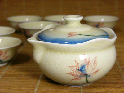 京徳茶器の茶壷(宝瓶)1客、茶杯6客のセットです。アイボリーとブルーのグラデーションに花の絵柄が描かれています。茶壷には金属製の漉し網付き。