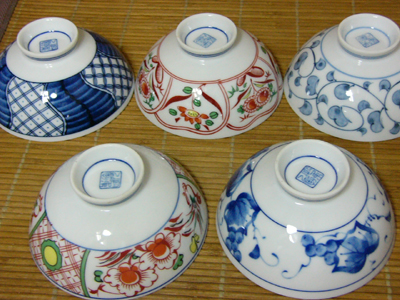 赤絵と染付の絵柄を配した、絵変りの飯碗5客セットです。
