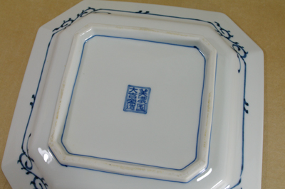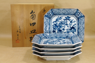 美濃焼大吉窯の角中皿5枚セットです。骨董の染付皿を思わせるような味わい豊かな角皿です。お刺身や煮魚、揚げ物など使いやすいサイズです。