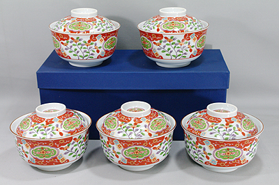 蓋物碗5客セットです。赤を基調にした美しい色彩の蓋碗です。程よいサイズの蓋物碗で、煮物などにいかがですか?小丼としてもお使いいただけます。松茸御飯に使えば、蓋を取ったとたん立ち上る松茸のかぐわしい香りがたまりません。