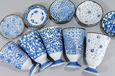 ぶるー浪漫ワインカップ5客、こつぶ皿5枚のセットです。表面はとても光沢ありつややかな釉薬に覆われています。たこ唐草、ダミ、小花ちらしなどの伝統文様替え替わりでデザインされています。ワインカップという商品名ですが、小ぶりなフリーカップなので、食前酒などにおすすめしたいです。こつぶ皿は受け皿としても、薬味や豆皿としてもお使いいただけます。