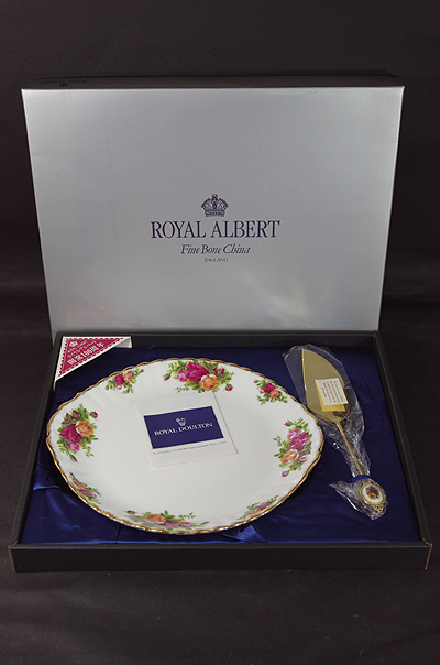 ロイヤルアルバートの開窯100周年を記念して発売された「オールドカントリーローズ」ケーキプレート1枚、ケーキサーバー1本のケーキセットです。金メッキのケーキサーバーはオールドカントリーローズのワンポイントが素敵です。