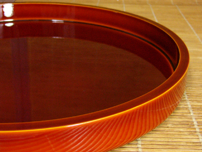 飛騨春慶塗の茶盆です。天然木の素地に塗りはカシュー。カシュー塗りは漆と非常によく似た成分を持つ天然素材で、カシューの殻から採れるものです。一見して漆との区別はほとんどつきません。あめ色の半透明の塗りを通してうっすら木目を望む、高級感漂う盆です。
