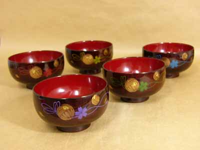 山中漆器の天然木製汁椀5客セットです。木目が透けて見える半透明の透きうるしに、色変わりのけまりの絵柄をほどこされています。