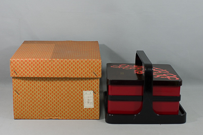 おせち料理に欠かせない二段重です。蓋には梅がデザインされています。持ち運びに便利な手提げ付き。