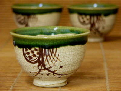 寛保2年に開窯した、瀬戸赤津焼の名窯、長谷元窯景陶の織部湯呑です。 深い緑釉は他では真似できない、赤津の織部ならではの色合い。