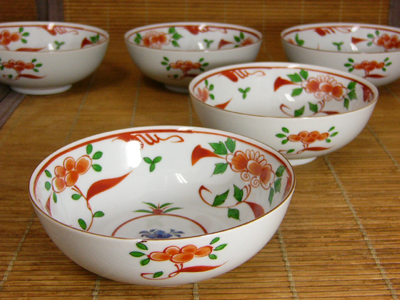たち吉の煮物鉢5客セットです。使いやすそうなサイズの赤絵のうつわです。赤絵のうつわをコーディネートに加えると、食卓の程よいアクセントになりますよ。