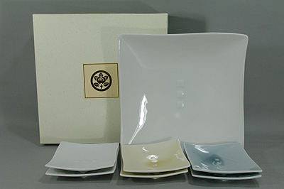 たち吉の大皿1枚、小皿6枚のセットです。商品名に「釉」とあるように、この器の美しさは釉薬そのものにあります。白磁の表面を覆うきめ細かく滑らかな釉薬は美しい光沢を放ちます。ややカーブしたシェイプも優しい釉薬と浴マッチしています。定期的に入荷する商品ですが、たち吉の中で私の好きな器のひとつです。