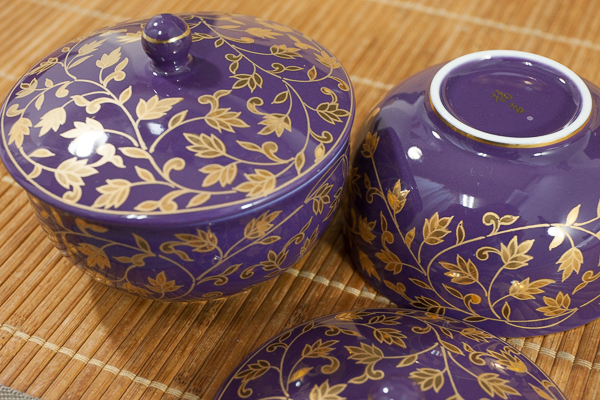 たち吉の蓋付き湯呑5客セットです。鮮やかな紫の地に金彩の唐草文を全体に配した高級感漂う湯呑です。大切なお客様のおもてなしにおすすめです。