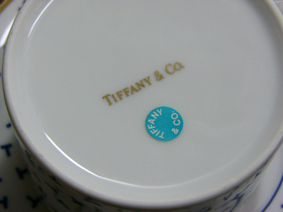 ティファニーカップ&ソーサー5客、マグカップ1客のセットです。金の縁取りにブルーでティファニーの「T」の文字を全体にちりばめた「ダンシングT」。とてもおしゃれなカップセット。